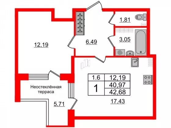 Продается однокомнатная квартира, 40.97 кв.м., 5/5 эт