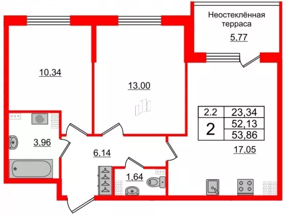 Продается 2-х комн. квартира, 52.13 кв.м., 5/5 эт