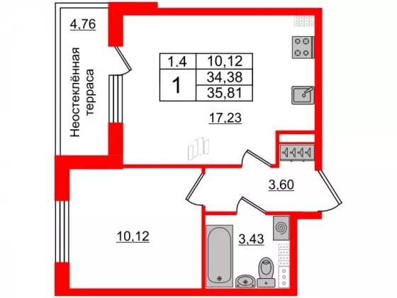 Продается однокомнатная квартира, 34.38 кв.м., 5/5 эт